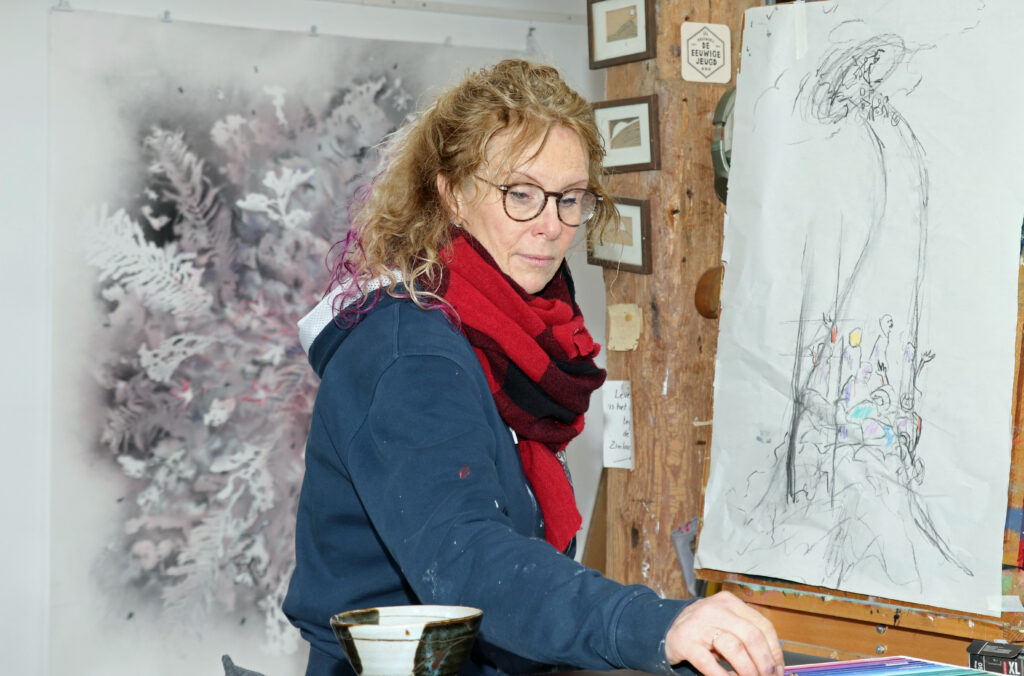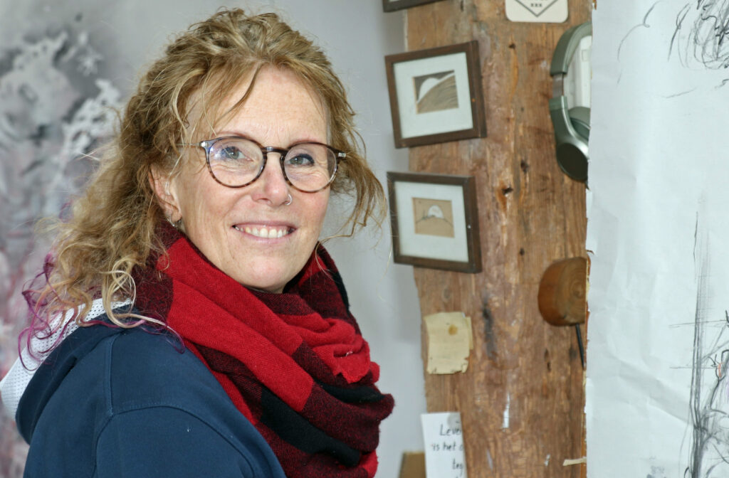 Zo maakte ze onlangs een prachtige, levensgrote tekening in houtskool en krijt van de omgevallen boomstronk vlakbij kasteel Slangenburg. Ook hierin is haar symboliek te zien, de zoektocht naar ‘verbinding.’ Wij zijn als mens verbonden met elkaar en met de natuur. Dat is wat ze met haar kunst wil zeggen.